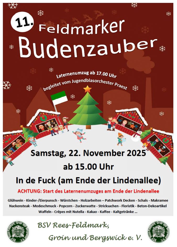 In wenigen Wochen ist es wieder soweit, denn dann feiern wir Feldmarker Schützen am Samstag, den 22.11.2025 ab 15 Uhr unseren mittlerweile „11. Feldmarker Budenzauber“ auf dem Hof in der Lindenallee 5 bei unserer Schützenschwester Christa Ruiter.