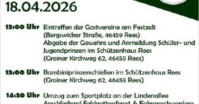 Der BSV Rees-Feldmark, Groin und Bergswick e. V. richtet im Jahr 2026 den Bezirksjungschützentag in Rees aus. Unter dem Motto ...